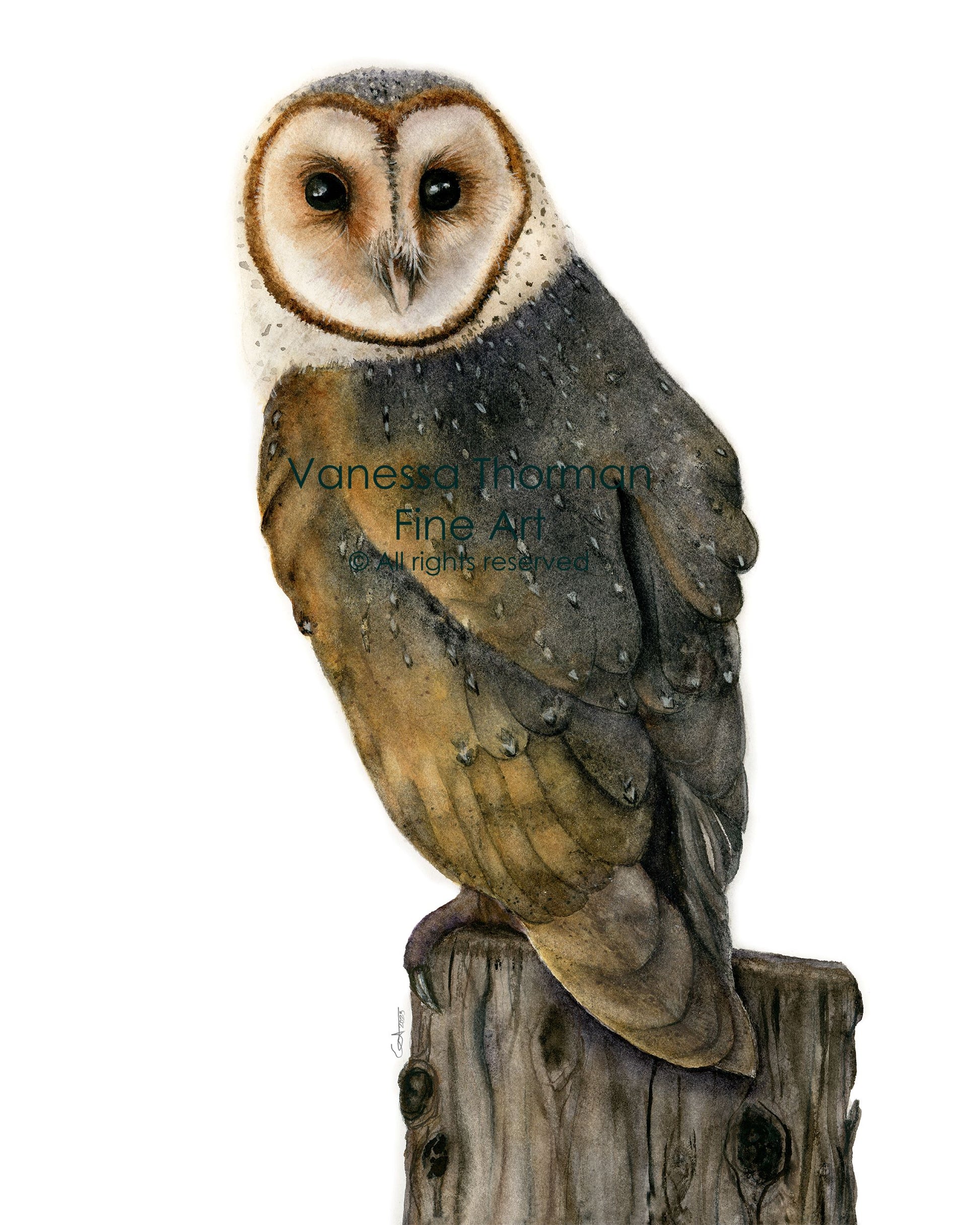 This watercolor fine art print features a Barn Owl. Known for their heart-shaped faces and silent flight, Barn Owls have long been symbols of wisdom and intuition.