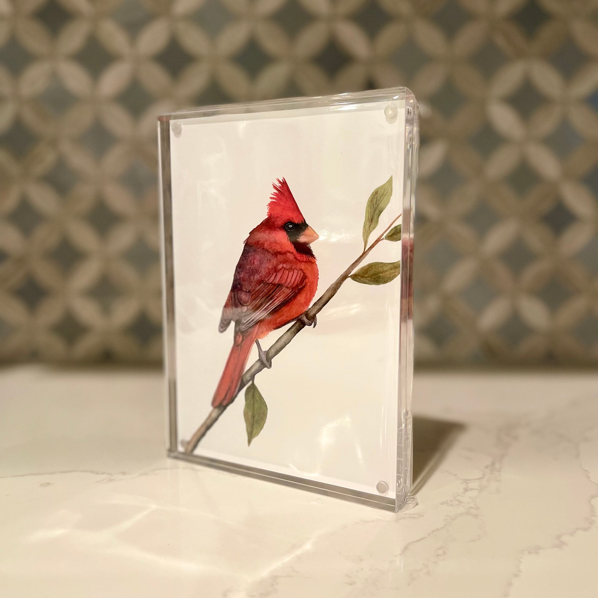 This 5x7 inch fine art giclée print showcasing the iconic Northern Cardinal is encased in a sleek, magnetic acrylic block frame, allowing it to stand freely on any flat surface. Perfect for adding a vibrant touch to your bookshelf, desk, or end table, this piece combines modern design with the striking beauty of this beloved songbird.