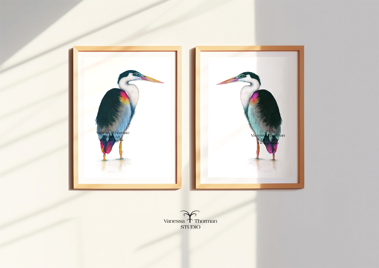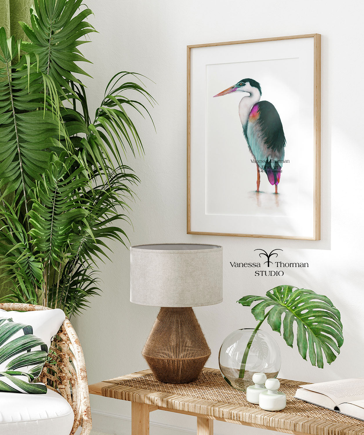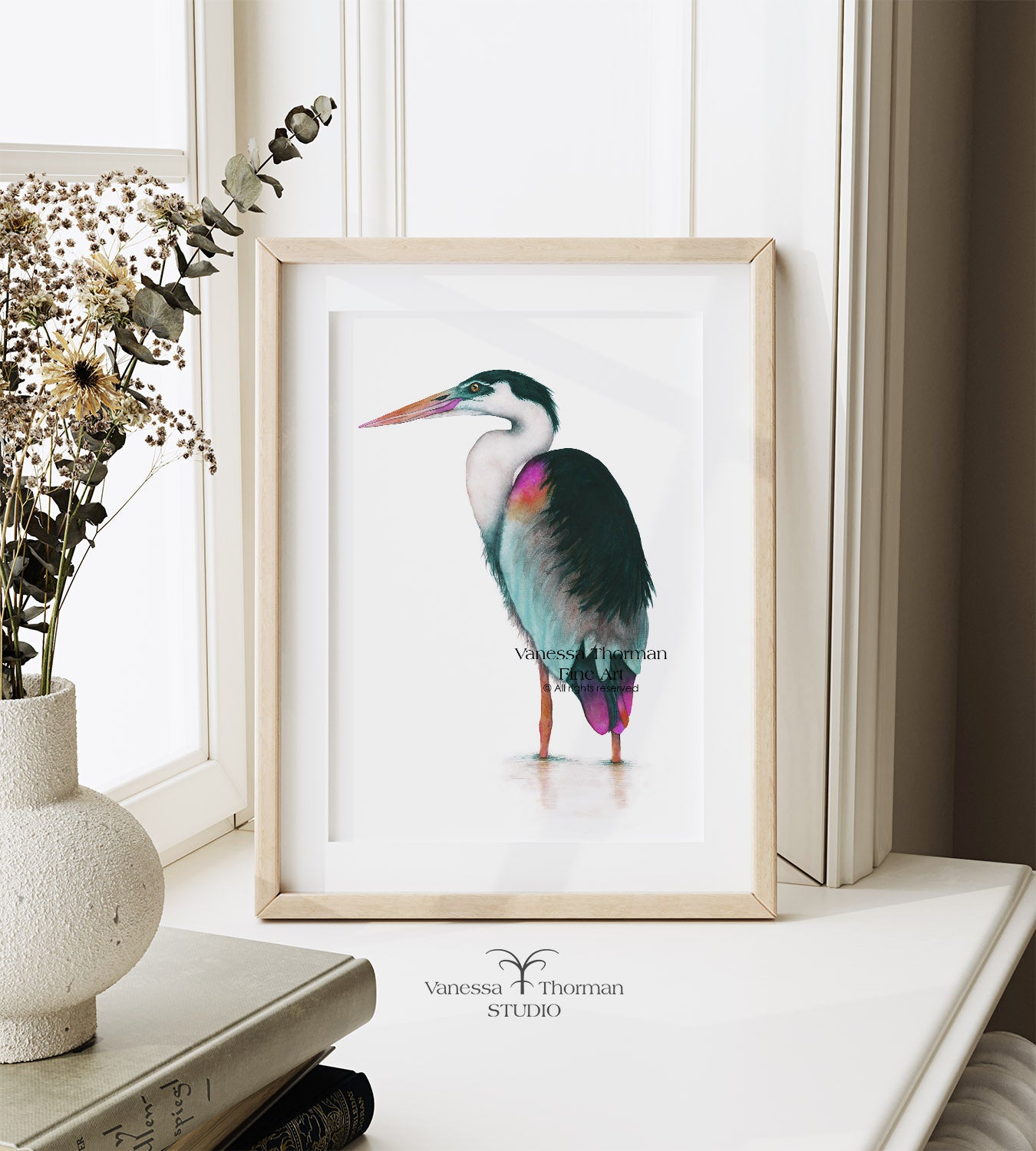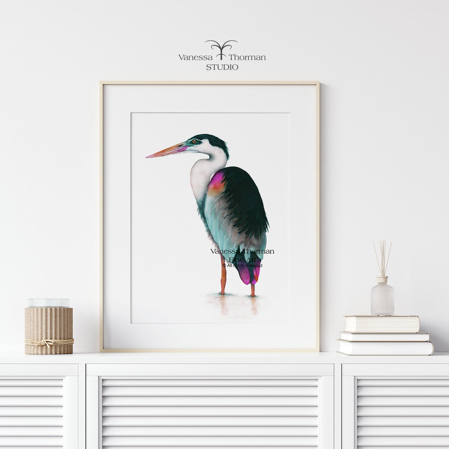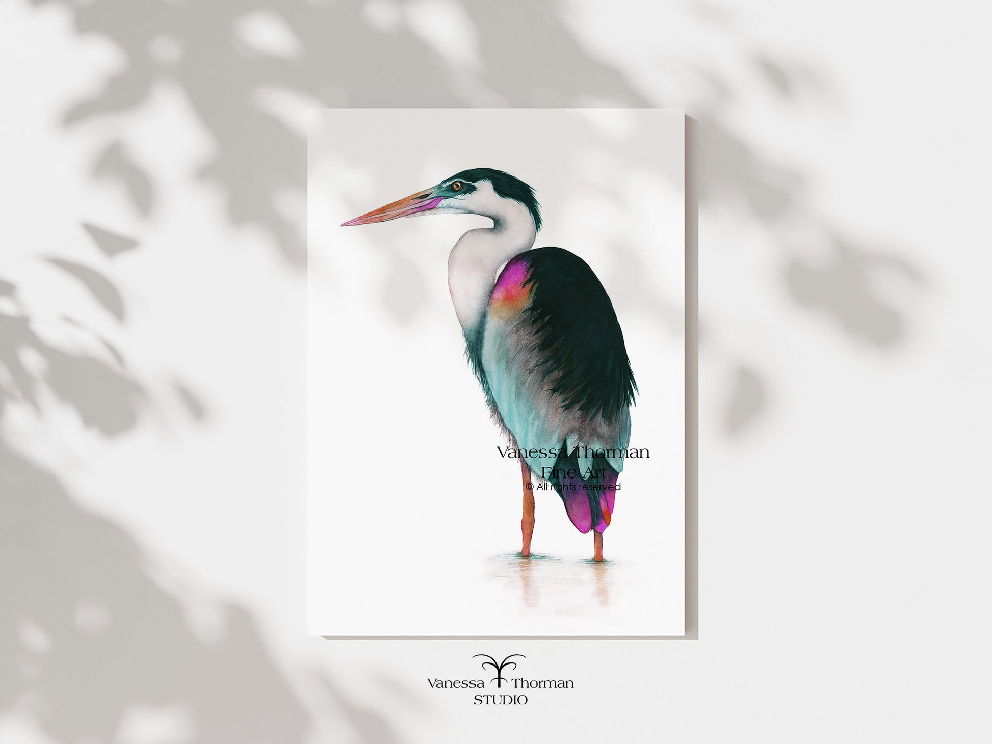 This watercolor fine art print is a whimsical interpretation of a heron, featuring bold splashes of vibrant color.