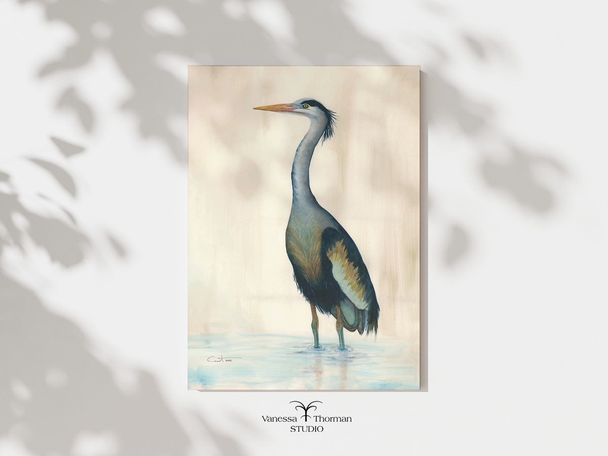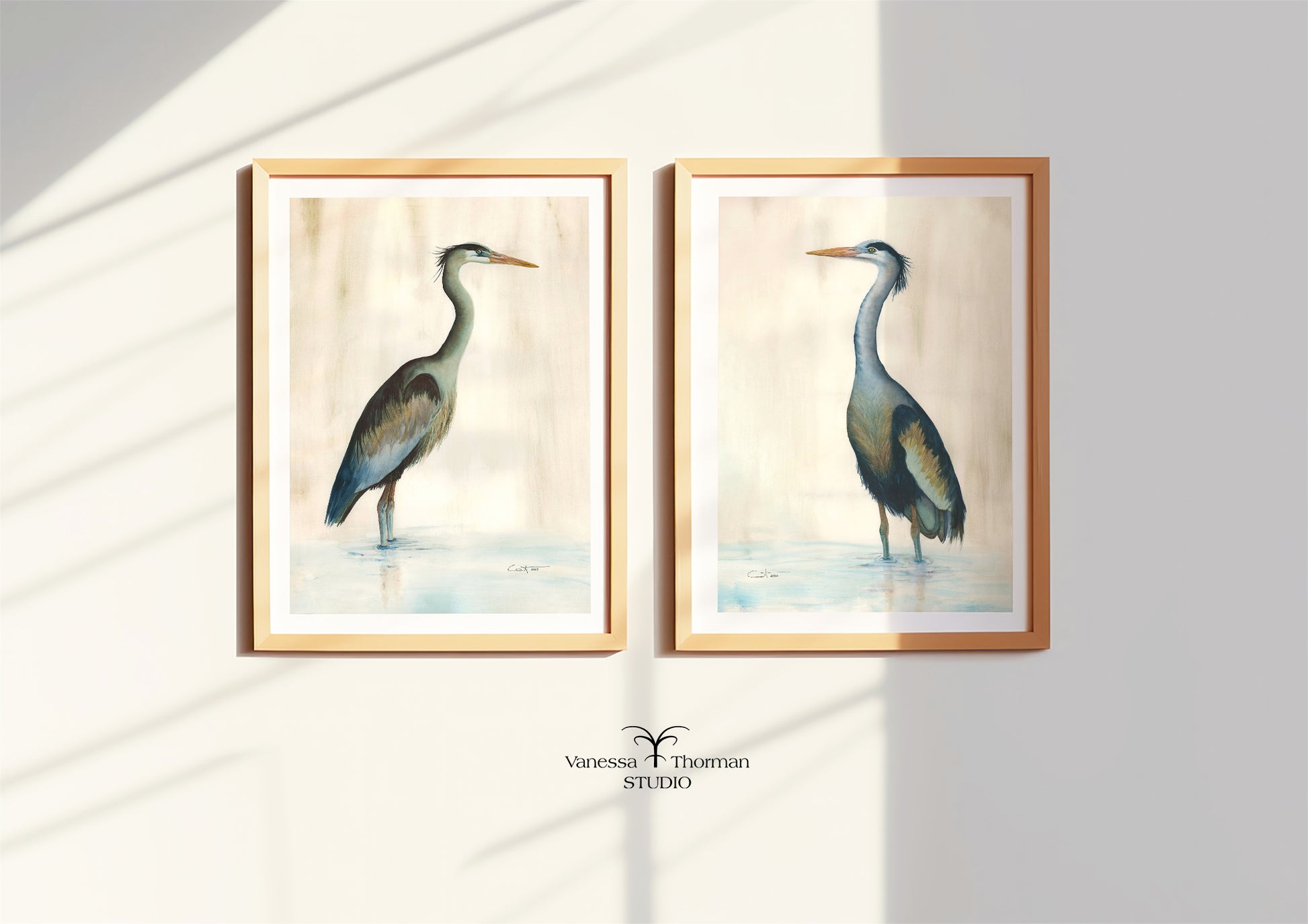 This watercolor fine art print features a beautiful heron with a soft gold and bronze background. This piece pairs beautifully with the Marsh Heron in green.