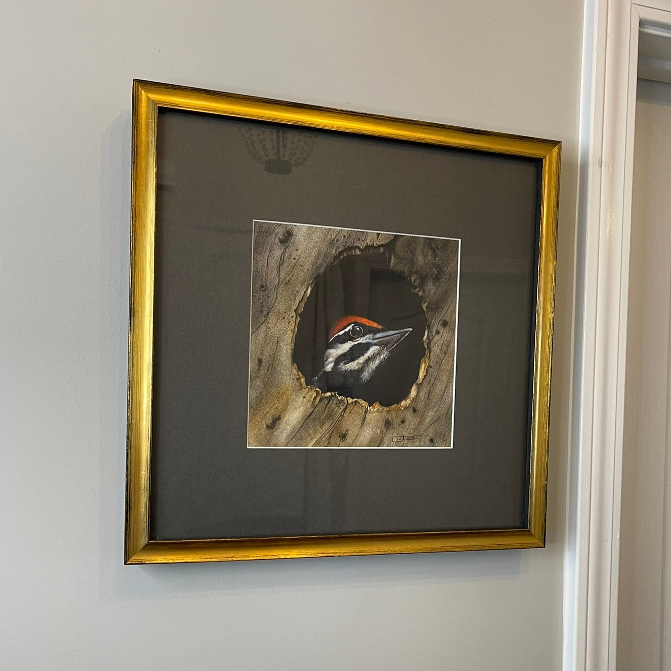 This fledgling Pileated Woodpecker peers out from its nest cavity, wide-eyed and hopeful, waiting for a parent to return. Scout captures that raw mix of curiosity and dependence that marks a bird’s first view of the world beyond the bark. Framed in a dark mat with UV protection, this piece was professionally finished by Campania and is ready to hang.