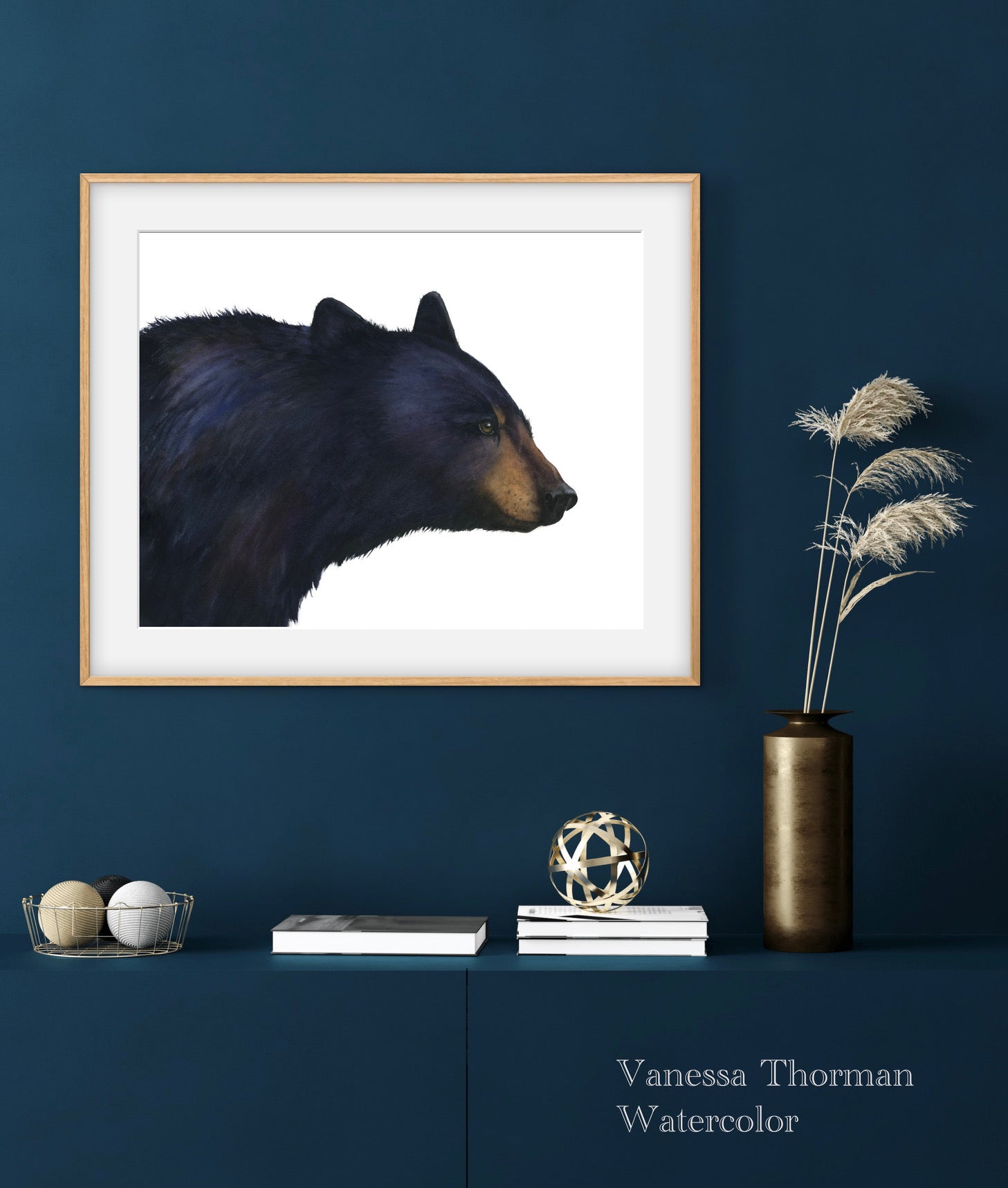 Shenandoah presents a quiet profile portrait of a Black Bear, inspired by photos from Yellowstone National Park. This side profile emphasizes the bear’s mass and dense fur while keeping the expression thoughtful. Deep blues and warm browns echo the shadowed forests of Yellowstone.