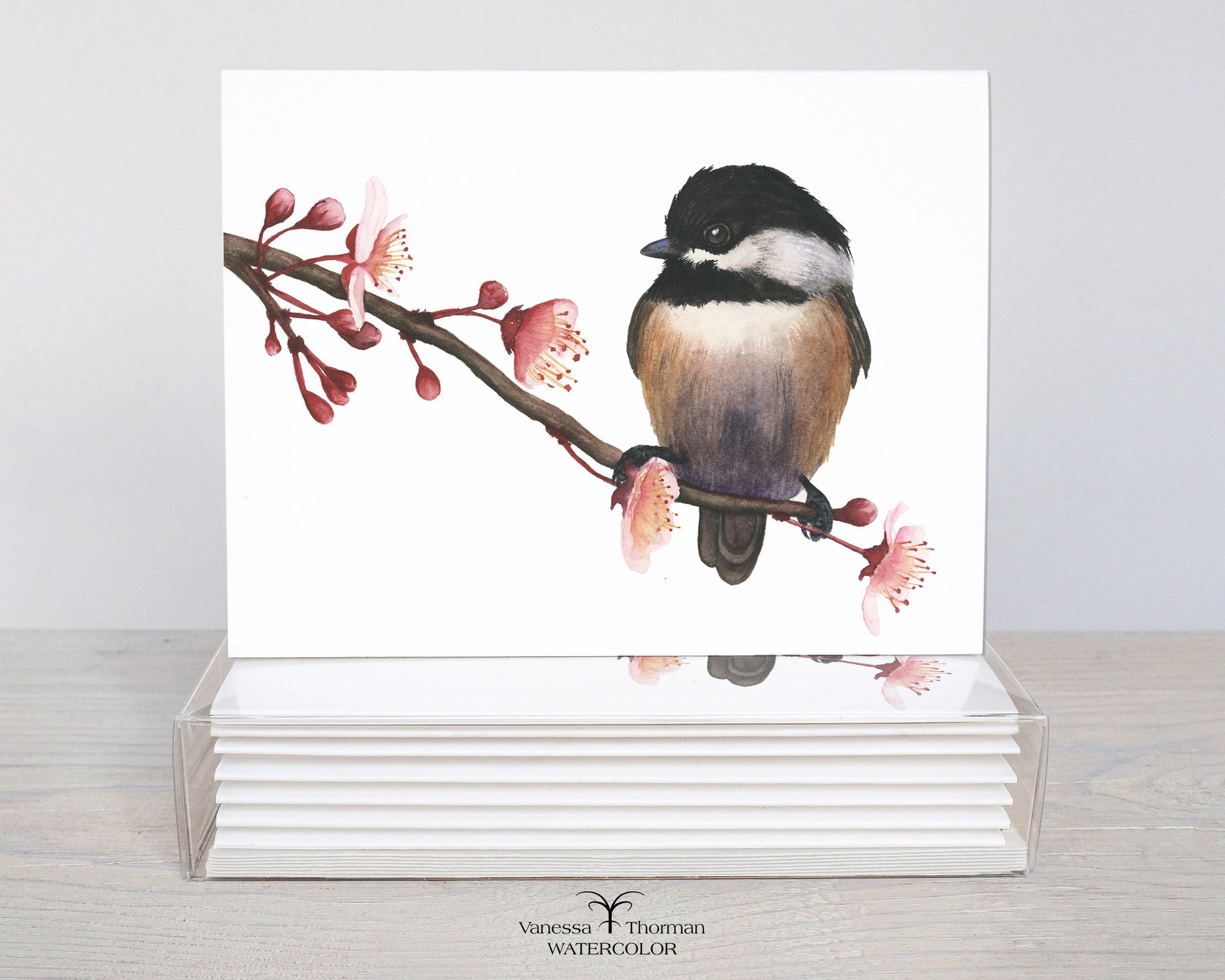 This set of Spring Chickadee notecards features one of the most familiar and beloved backyard birds, perched among delicate early blossoms. Known for their curiosity and gentle presence, chickadees are often associated with the quiet return of spring. The soft neutrals of the bird contrast with the warm pinks of the budding branch, creating a design that feels fresh, calm, and quietly joyful.
