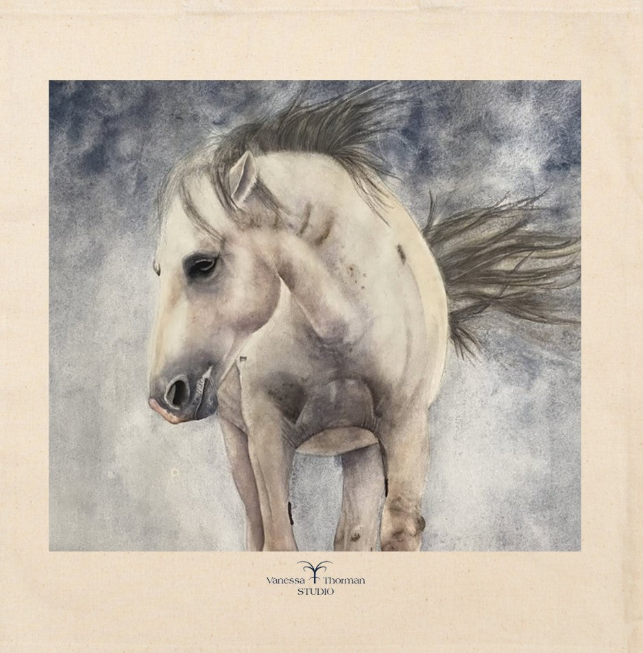 Carry a symbol of resilience with Weather the Storm, a canvas tote featuring Vanessa Thorman’s original watercolor portrait of a wild mustang. This lightweight, eco-friendly bag is crafted from 100% natural cotton and printed with water-based inks that won’t peel or fade. Designed in Charlotte, NC, and printed in Nashville, TN, it’s the perfect everyday tote for equestrians, horse lovers, and nature enthusiasts alike.