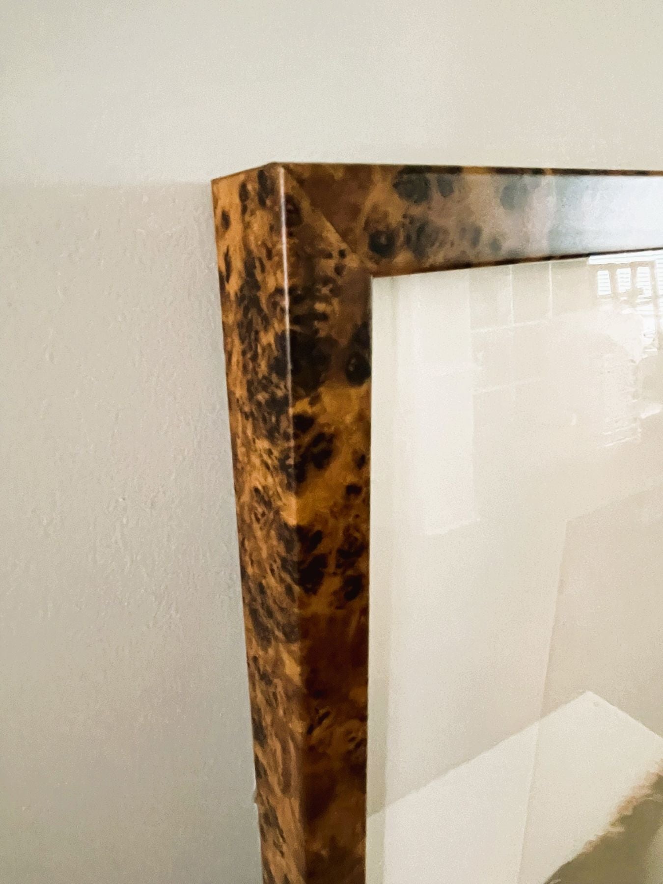 Framed in a rich burl wood frame with an 8-ply mat and UV-filtering acrylic glazing